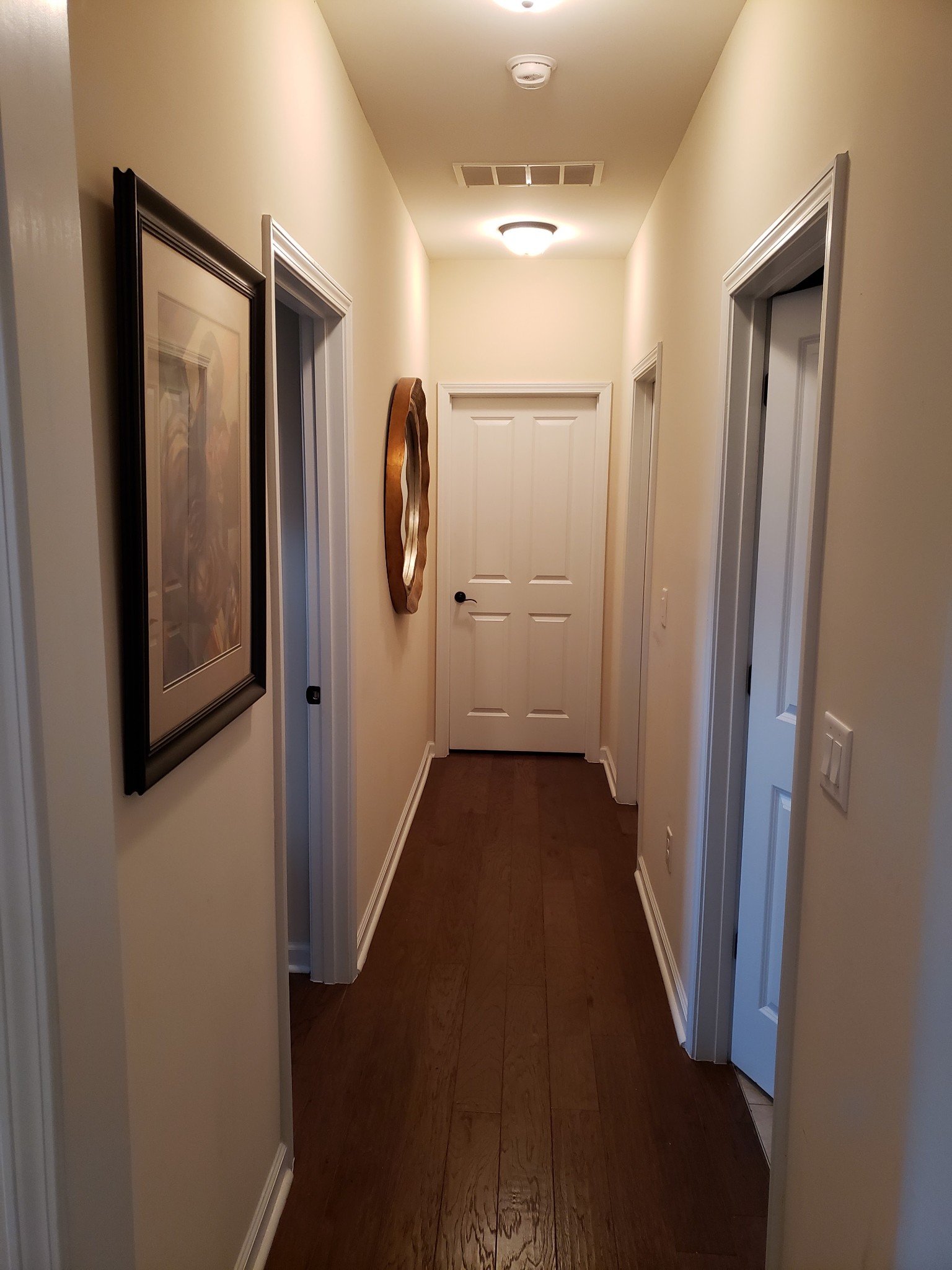 The hallway now feels larger, cleaner, and more inviting. The lighter paint reflects more light, instantly improving the flow of the home. Doorways, trim, and wall surfaces look sharper and more polished — the type of finish homeowners expect from a professional painting company.